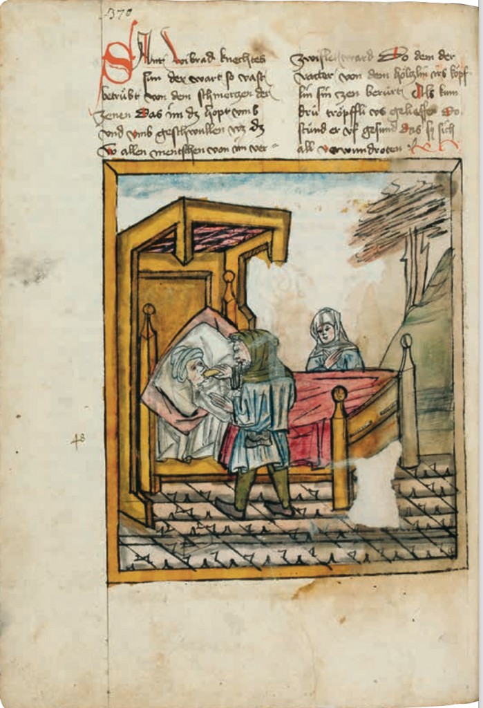 Esta obligación moral con los enfermos se ha traducido a lo largo y ancho de la Cristiandad en milagros y leyendas de santos, que tampoco faltan en “Abracadabra”. Además de los dedicados a la vida de San Galo, descubrimos a otros santos menos conocidos entre los documentos de la abadía. Es el caso de la suiza Santa Viborada, que tras morir como mártir a manos de los invasores húngaros, realizó diferentes milagros a través de sus reliquias, casi todos ligados a la curación de enfermedades. En una valiosa miniatura del siglo XV (Cod. Sang. 602) se cuenta el milagro de la curación del dolor de muelas de un muchacho, cuyo padre le hace morder un trozo de madera perteneciente a alguno de los objetos personales de la santa.