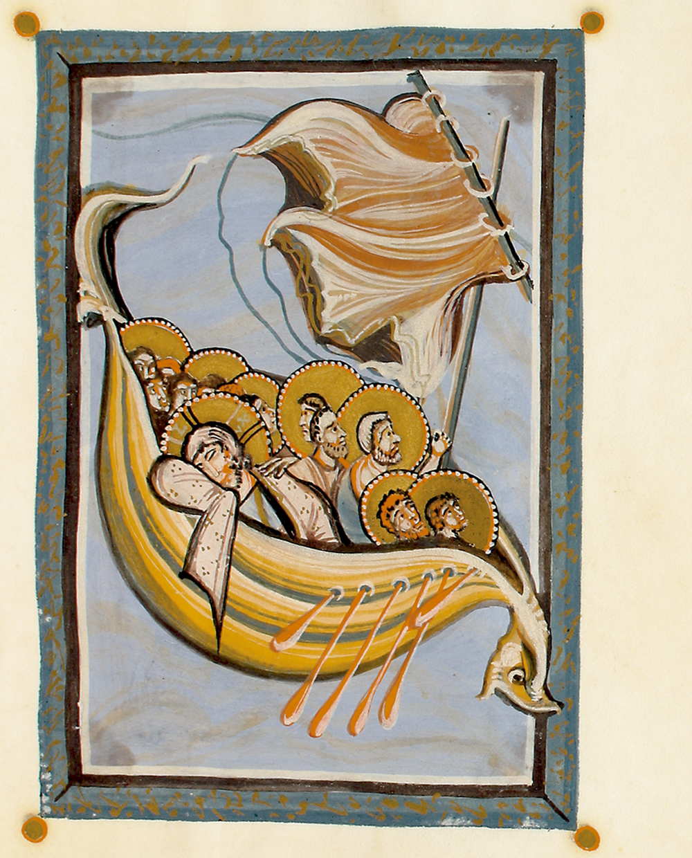 El campo óptico rectangular rodeado por un pesado marco como si de un lienzo se tratase, se ve sobrepasado por el temperamento del pintor, que ha inclinado la barca dentro del espacio ilustrativo. Pero las varillas de la vela  desaparecen a la derecha por detrás del marco de la imagen, para emerger de nuevo arriba. De esta forma la imagen es a la vez fondo ornamental y espacio ilustrativo. Las cabezas de los Apóstoles, en diferentes movimientos, aparecen apiñadas estrechamente.