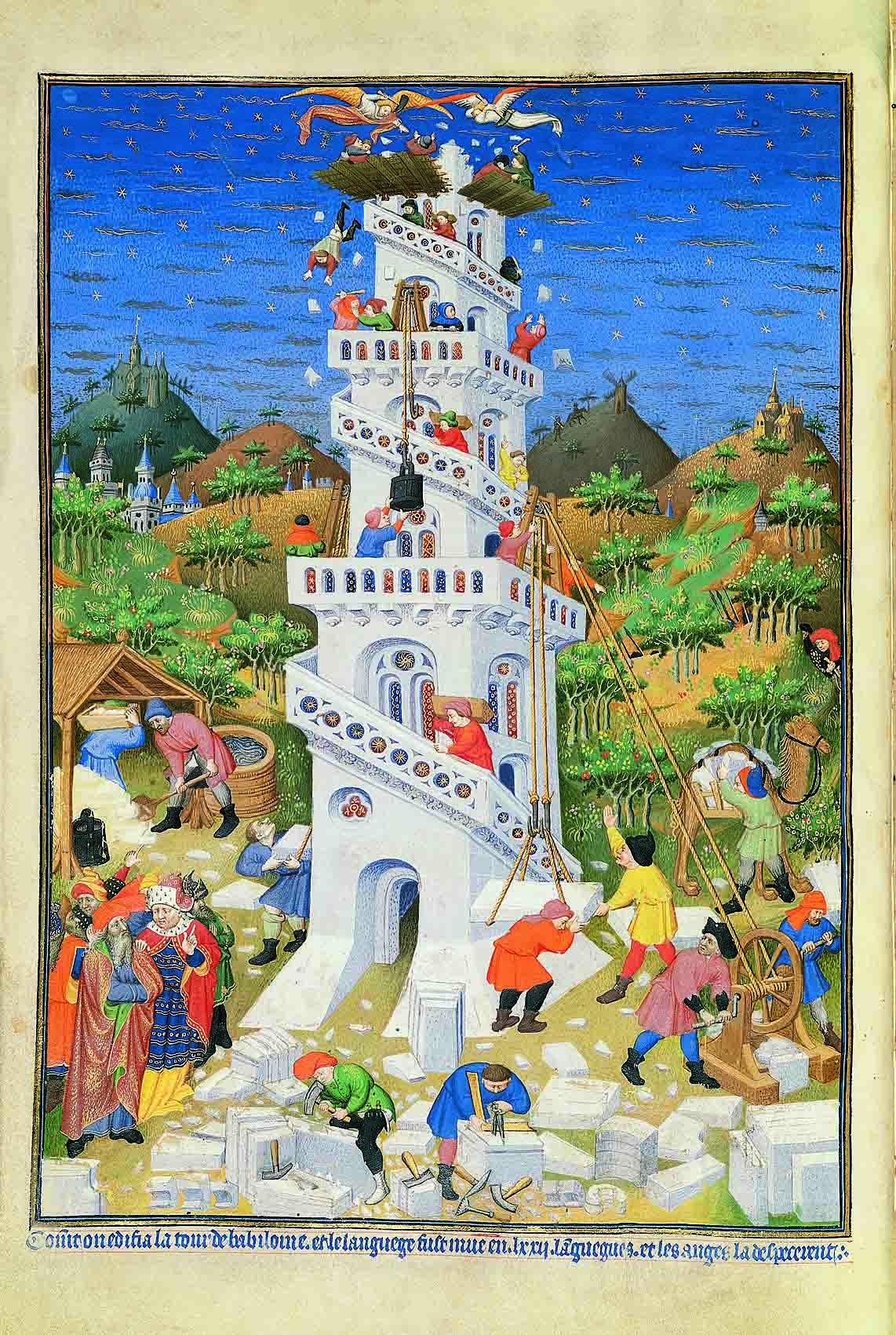 La miniatura de la construcción de la Torre de Babel, una obra nacida de la soberbia humana, según la narración bíblica, muestra de una manera muy realista la construcción de un edificio de piedra a principios del siglo XV. Esta delicada miniatura, realizada con todo tipo de detalles artísticos, es una de las cuatro ilustraciones de página entera, correspondiente al Antiguo Testamento, que se encuentra situada al comienzo del célebre y preciado libro de horas The Bedford Hours.